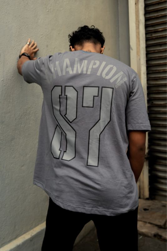 Get ready to elevate your casual look with the Champion Grey Oversized Tee. With the iconic Champion 87 print and a relaxed fit, this tee is perfect for any occasion. Stay comfortable and stylish all day long with this must-have wardrobe addition.